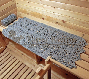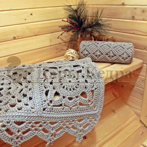 Ковер и подушка ручной работы сделают комнату отдыха в бане, квартире или доме уютной, теплой и современной. Ковер идеально ровно ложится на полу или полке в бане. Его не придется выправлять, выравнивать, профессиональная вязка мастерицы не оставит равнодушным даже самого взыскательного покупателя.